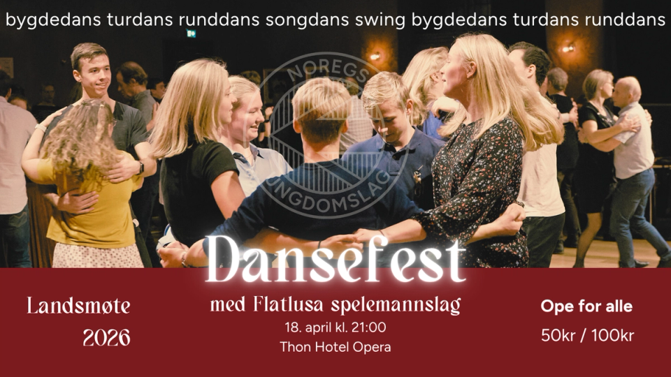 I samband med landsmøtet i Noregs Ungdomslag inviterer me til stor dansefest på Thon Hotel Opera. Her ligg alt til rette for ein kveld med musikk, rørsle og godt lag, når Flatlusa spelemannslag frå Ås spelar opp til dans.