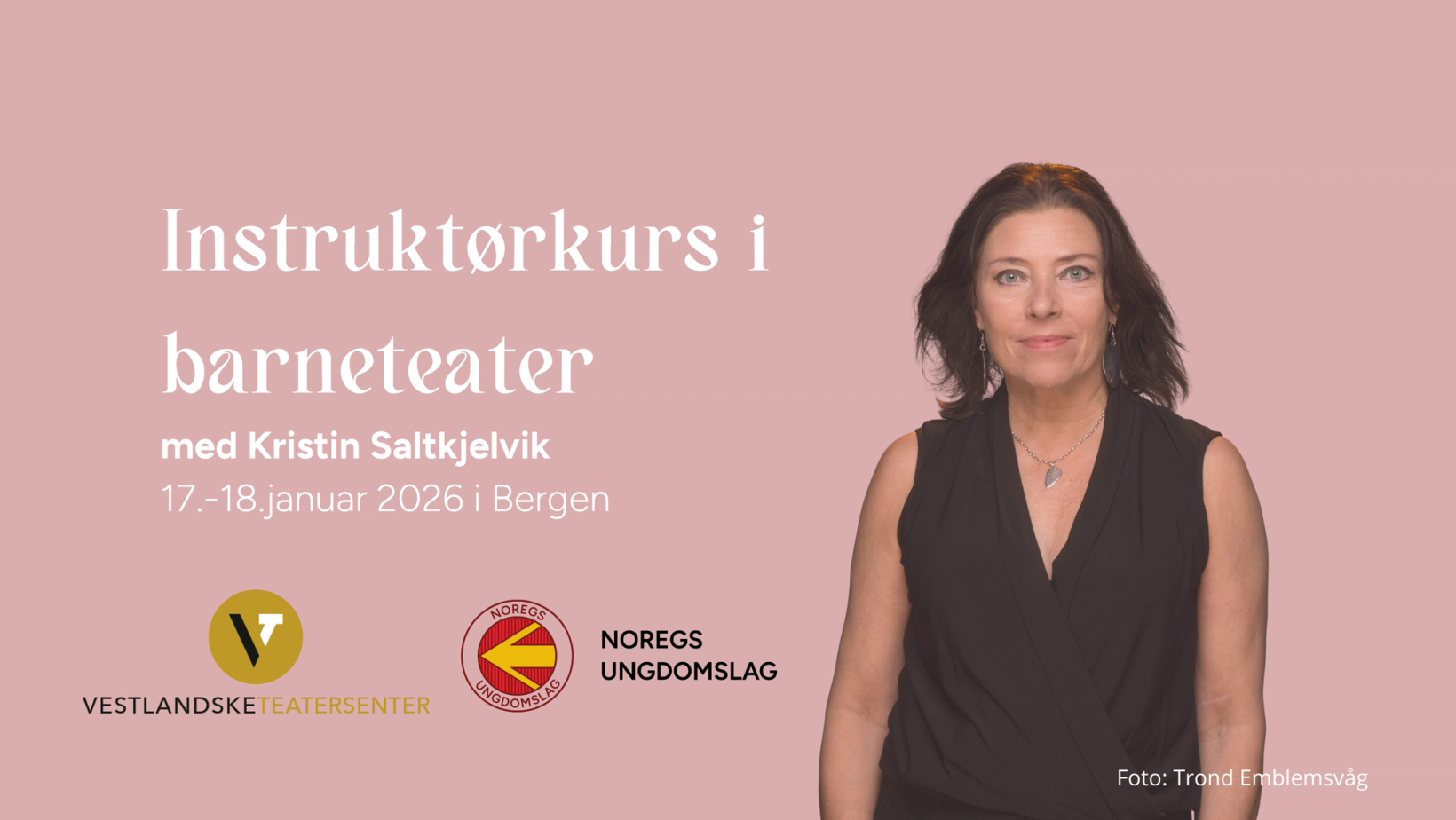 Instruktør på kurset er Kristin Saltkjelvik. Ho er utdanna skodespelar og dramapedagog. I 2015 tok ho etterutdanning som kunstnerlærar (Teaching Artist). Kristin har gjennom si stilling ved Vestlandske Teatersenter (VT) opparbeidd seg 25 års erfaring som teaterinstruktør for barn og unge. VT underviser 100 teaterskuleelevar i alderen 8-20 år kvar veke, og har i tillegg tilbod for både yngre barn og vaksne amatørar.