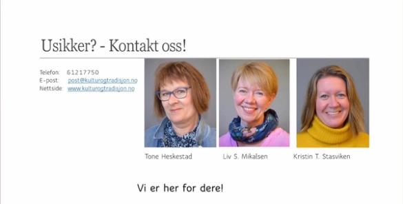 Du kan anten ringe dei på telefon 61 21 77 50, eller sende mail til post@kulturogtradisjon.no. Da er Tone Heskedal, Liv S. Mikalsen eller Kristin T. Stasviken der for å hjelpe deg!